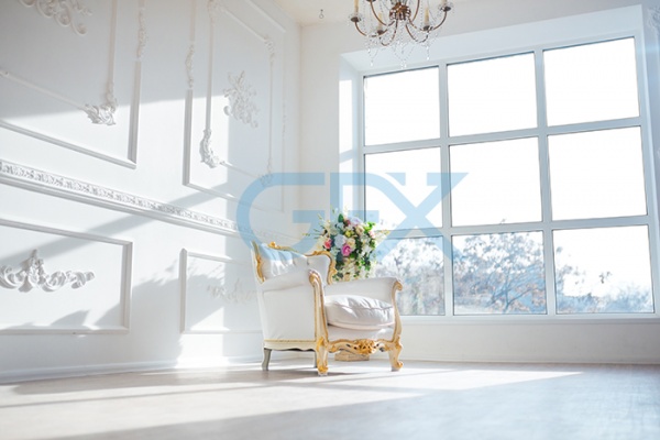 دانلود عکس استوک نمای داخلی خانه و یک مبل تک نفره سفید با کیفیت بالا