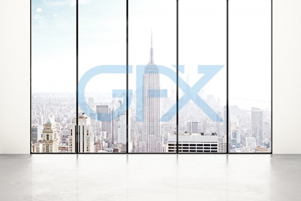 دانلود عکس استوک یک اتاق سفید خالی با نمای شهر و پنجره های بزرگ