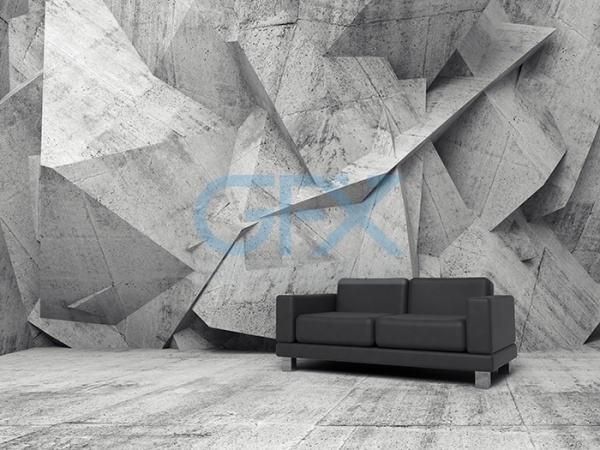 دانلود عکس استوک نمای داخلی اتاق با الگوی شلوغ بر روی دیوار به همراه مبل چرم