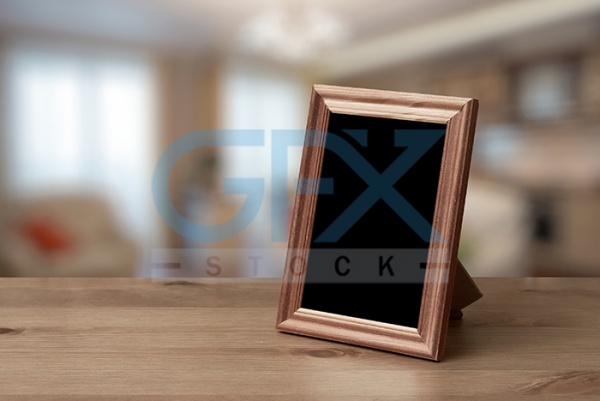 دانلود عکس استوک یک قاب عکس روی میز چوبی در اتاق نشیمن