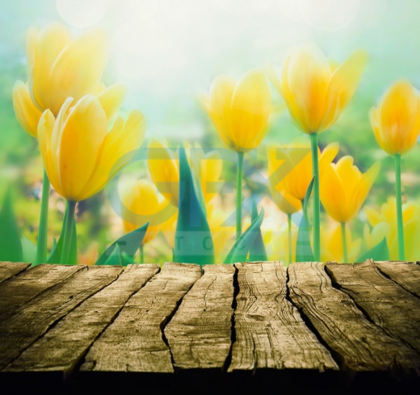 دانلود عکس استوک پس زمینه گل بهاری با میز چوبی